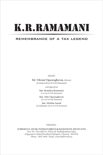 A book containing hundreds of tributes has been compiled on Late Sri.K.R.Ramamani. We have also released a SUPPLEMENTARY EDITION which contains additional tributes, indices of the main Book as well as the Proceedings of the K.R.Ramamani Memorial Lecture 2012 on the occasion of the Golden Jubilee of the Revenue Bar Association, Chennai.